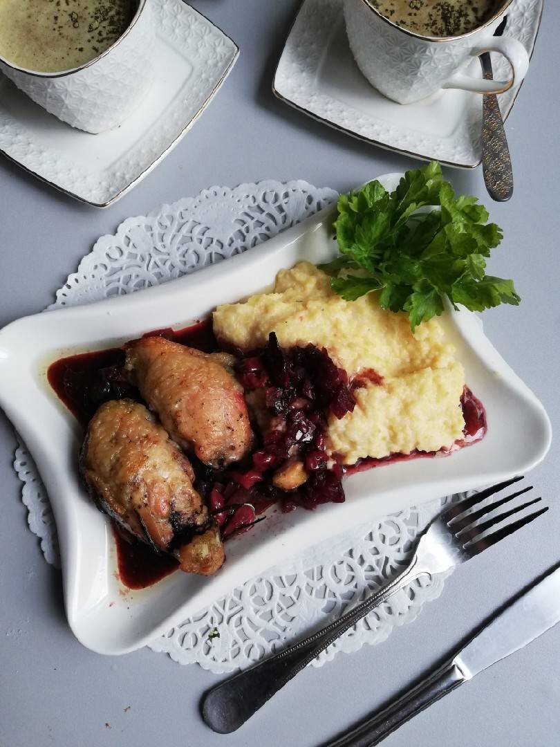Жареная курица с кислой вишней в бальзамическом уксусе со сливочной полентой очень лёгкое в приготовлении блюдо Ингредиенты: гр кислой вишни (у меня замороженная), гр бальзамического уксуса, целая курица, гр поленты, красные луковицы, оливкового масла, розмарина, воды, молока, гр пармезана, гр сливочного масла Способ приготовления: Духовку разогрейте до 200° Нарежьте курицу на кусочки, отдельно крылья, бёдра, грудку. Спинную часть уберите на будущее для бульона. Оставшиеся кусочки посолите, поперчите. Мелко нарежьте лук, очистите вишню от косточек. Сложите вишню с луком в глубокую кастрюлю, добавьте уксус, оливковое масло, розмарин. Посолите, поперчите, поверх выложите курицу и запекайте 40 минут. Смешайте воду с молоком в кастрюле и доведите до кипения. Добавьте поленту, постоянно помешивая, варите 20 минут. Когда полента будет готова, добавьте сливочное масло и натрите пармезан. Я ещё добавила приправу "Кухарек" Подавайте поленту с хрустящей курицей и вишней.
