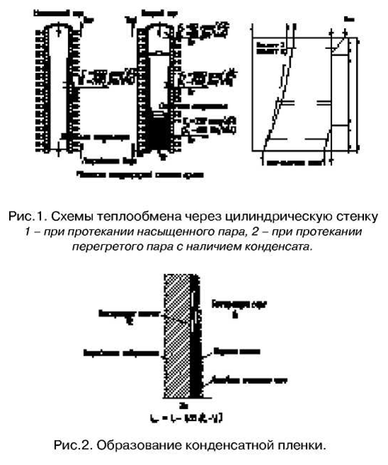 На рис. 1 представлены схемы теплообмена через цилиндрическую стенку от греющей среды (пар) к воде 1) при протекании насыщенного пара; 2) при протекании перегретого пара с наличием конденсата, которые, как показывает практика, можно положить в основу практических расчетов. Из температурного графика видно, что в случае 2 температура нагреваемого вида ниже, если перегретый пар подпитывается, а конденсат скапливается.