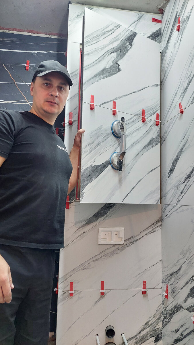 Здравствуйте дорогоие мои подписчики. Сегодня мы быстро пробежимся по особенностям люка скрытого монтажа. Чеще всего люк устанавливают над инсталяцией,это отличное место для разводки сантехники,фильтров,счётчиков итд. У меня сейчас в проекте люк 600×1200 фирмы Практика. Сам люк этой фирмы очень качественный и я много лет покупаю именно этой фирмы и всем рекомендую. Не провисает,регулируется и очень прочная жесткая рама. Поскольку производители керамогранита ITALON рекомендуют межплиточный шов от 1,5мм я в зоне люка делаю шов 2мм. Так как вес плиты большой и на 1мм люк может просесть и если у вас шов был всего 1мм это будет критично. После установки люка, очень важно его нагрузить подвесив груз равный приклеенной плитке,о чём и пишет сам производитель Что я всегда и делаю. Мешок с керамогранитом подвешен. Дальше закрываю люк и занимаюсь облицовкой. Примерно на пол миллиметра люк просел,но это не точно ,может мне это кажется. Если у вас есть возможность изготовить встроенный шкаф в