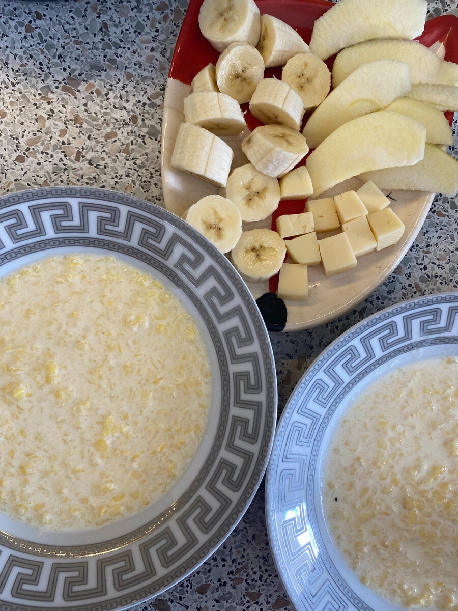- Завтрак кукурузная каша, немного сыра, яблоко и банан.