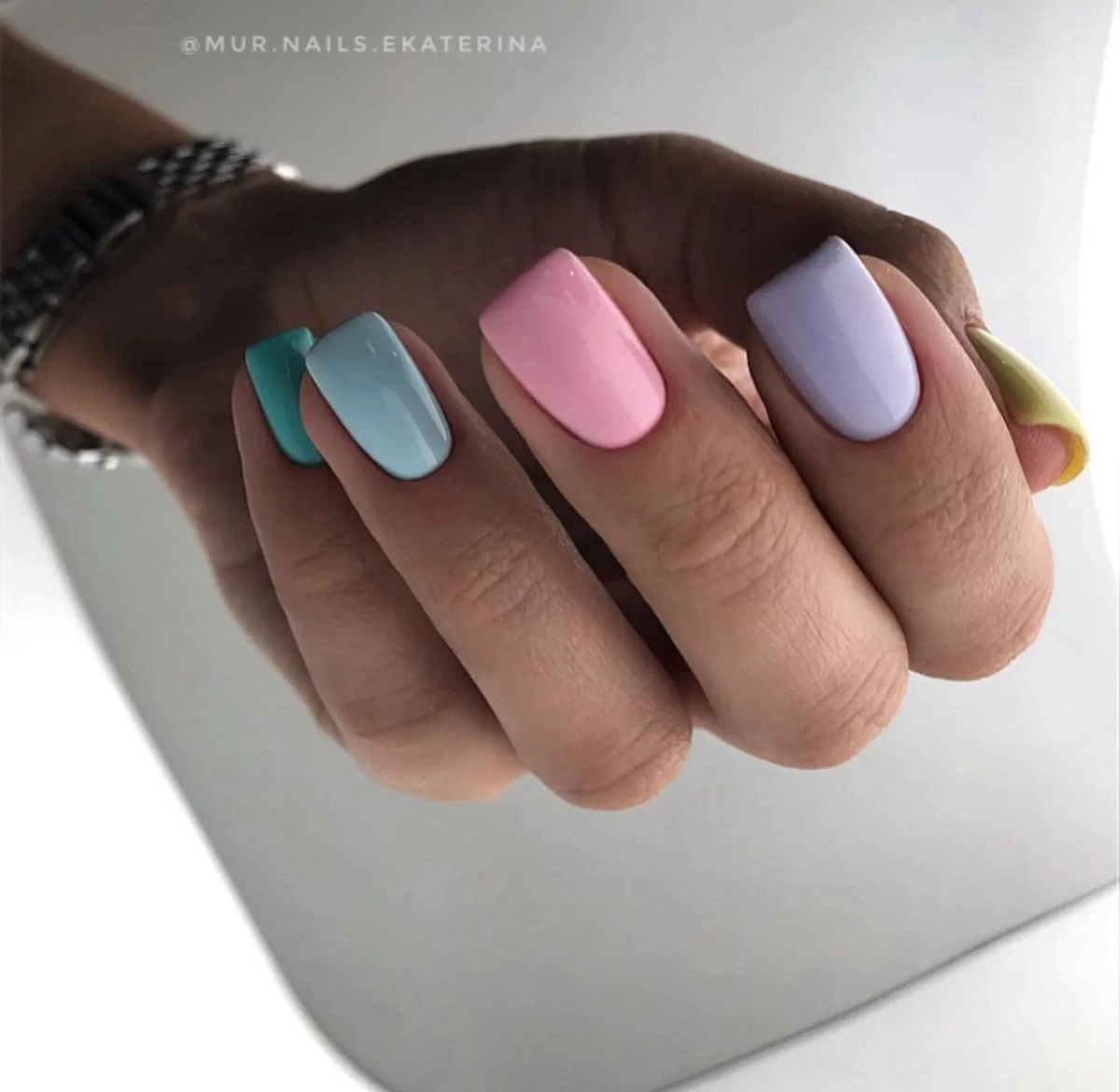 Один из главных трендов этой весны - пастель. Это может быть однотонный маникюр, цветочные или абстрактные дизайны. Ну и конечно, один из самых популярных (и при этом простых) дизайнов - использование разных оттенков на каждом ноготке. Если же в арсенале вашего мастера по какой-либо причине таких оттенков нет, их вполне можно заменить цветными базами, которые за счет своей мягкости и полупрозрачности тоже выглядят очень нежно. Подпишись на невероятно интересный канал про маникюр