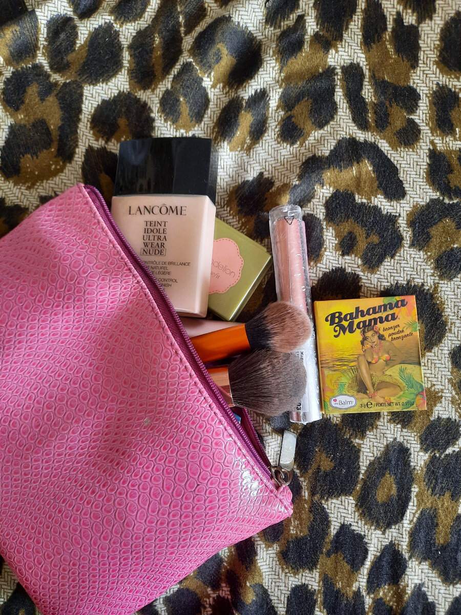 Поделюсь своими штучками для макияжа 😏 Набор средств минимальный, но этого хватит для полноценного макияжа 👌 Тональный крем в лёгкой тубе, у меня Ланком, версия нюд. Очень лёгкий тональный крем, жидкий, но делает хорошее равномерное покрытие. Не перекроет явные недостатки, но на коже смотрится красиво. Пудра Никс HD, дорожный вариант, очень люблю именно эту пудру, она хорошо ложится, делает лёгкий блюр. Главное не перестараться, пудра немного выбеливает. Для контуринга у меня миниатюры от бенефит и the balm. Хайлатер идеален на каждый день, он даёт легкое свечение кожи, то, что я люблю в хайлайтерах. Румяна не яркие, не стойкие, но красиво выглядят на коже, тоже хороший вариант на каждый день. Матовый бронзер багама мама я использую как скульптор. Он достаточно яркий, поэтому нужно наносить аккуратно. И ещё от имеет тёплый подтон, но тем не менее на коже смотрится хорошо. Нанесла на голую кожу. В дорожной косметичке у меня обычно нет теней и карандаша, мой макияж имеет формат эк