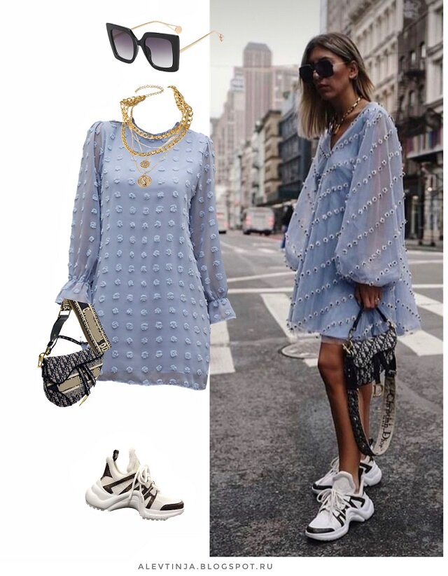 Воздушное платье серо-голубого оттенка с массивными кроссовками? Почему бы и да! Приёмчик не новый, сейчас им уже никого не удивишь. А какие-то лет 5-7 назад (или чуть раньше?) это выглядело революционно. Как вам?