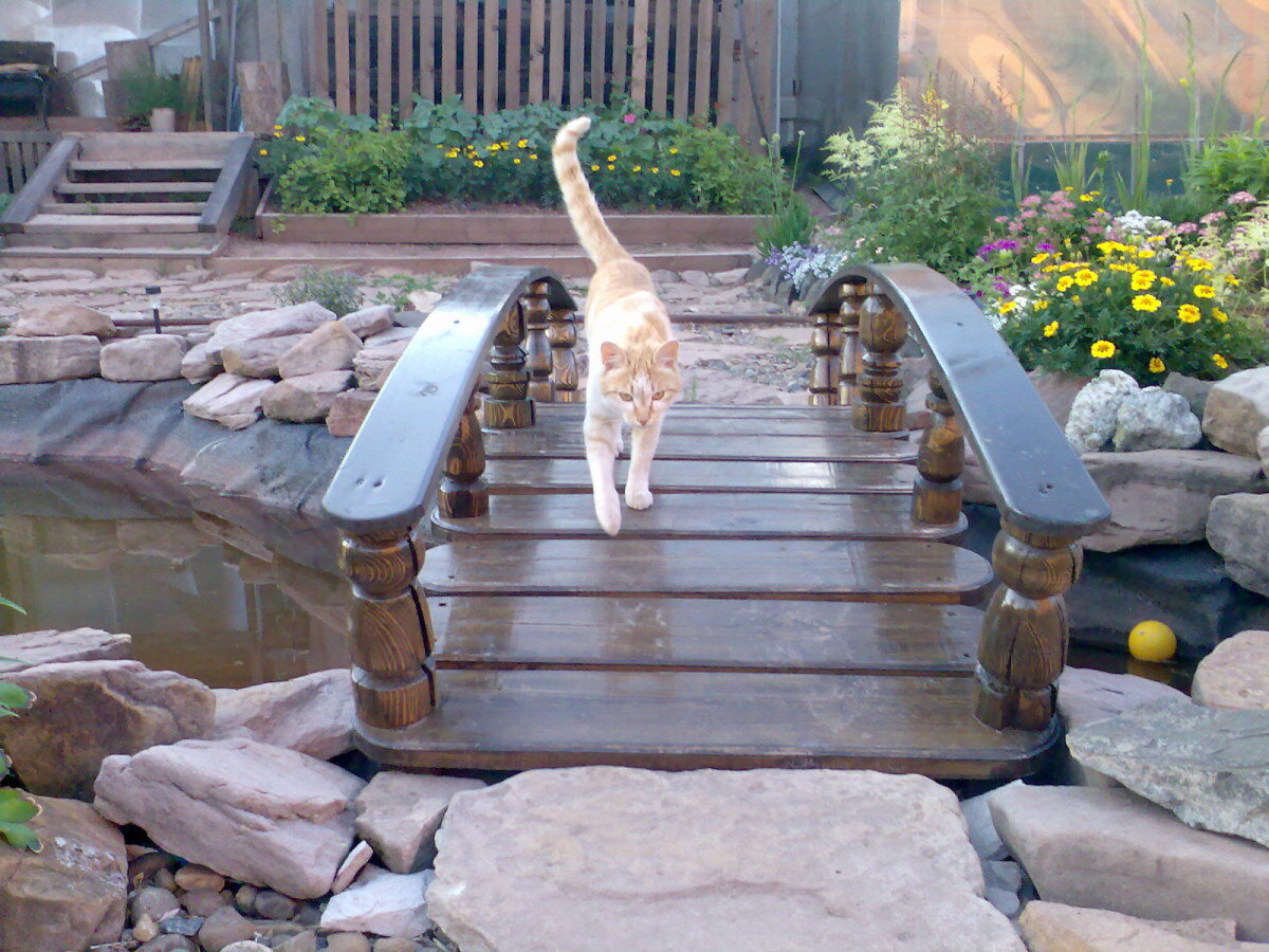 Мои домашние животные, которые в прошлом жили в квартире, неплохо приспособились к обитанию в частном доме, а именно, начали, в прямом смысле слова, хозяйничать на участке. Кошке Черри уже 8-ой год и большую часть своей жизни она не видела других сородичей, что уж тут говорить про собак, кроме Рича. Если я и отпускаю свои питомцев гулять самостоятельно, то только в пределах участка, который огорожен забором. Ночью все мои питомцы спят дома. У меня стерилизованная кошечка и первое время она внимательно наблюдала за другими котами и собаками, которые прогуливались за забором по общей дороге. А вот совсем недавно я, выйдя из дома, застала такую картину: в одном углу нашего участка сидел белый кот, у бани — рыжий, а на деревянном мостике над прудом — еще один бело-рыжий. Больше всего я думала, где же моя скромняшка. — «Черри,» — кричу я, а сама боюсь даже представить что же это за собрание, еще и на нашей территории. И тут моя вылетает из травы, которая растет в центре участка. Я беру ко