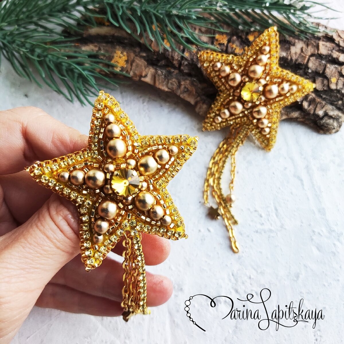 Звёздочки ясные, звёзды высокие! Что вы храните в себе, что скрываете? Звёзды, таящие мысли глубокие, Силой какою вы душу пленяете? Частые звёздочки, звёздочки тесные! Что в вас прекрасного, что в вас могучего? Чем увлекаете, звёзды небесные, Силу великую знания жгучего? И почему так, когда вы сияете, Маните в небо, в объятья широкие? Смотрите нежно так, сердце ласкаете, Звёзды небесные, звёзды далекие! Сергей Есенин Часто в украшениях используются символы природы(изображения растений, фигурки животных ), небесные светила (солнце, луна, звезда), геометрические фигуры. Звезда – как свет, сияющий во тьме, является символом духа. Она поддерживает силы духа, выступающие против сил тьмы. Для изготовления броши понадобятся: ▪️ жесткий фетр толщ. 1 -1,5 мм, ▪️ страз 8 мм - 1 шт., ▪️ жемчуг 3 мм - 10 шт, 4 мм - 6 шт (1 на подвеску), и 6 мм - 5 шт., ▪️ стразовая цепочка 2 мм, ▪️ бисер №10, ▪️ цепочка под золото, ▪️ пины, ▪️ звёздочка 6 мм, ▪️ нитки капроновые №50, ▪️ клей "Момент-Кри