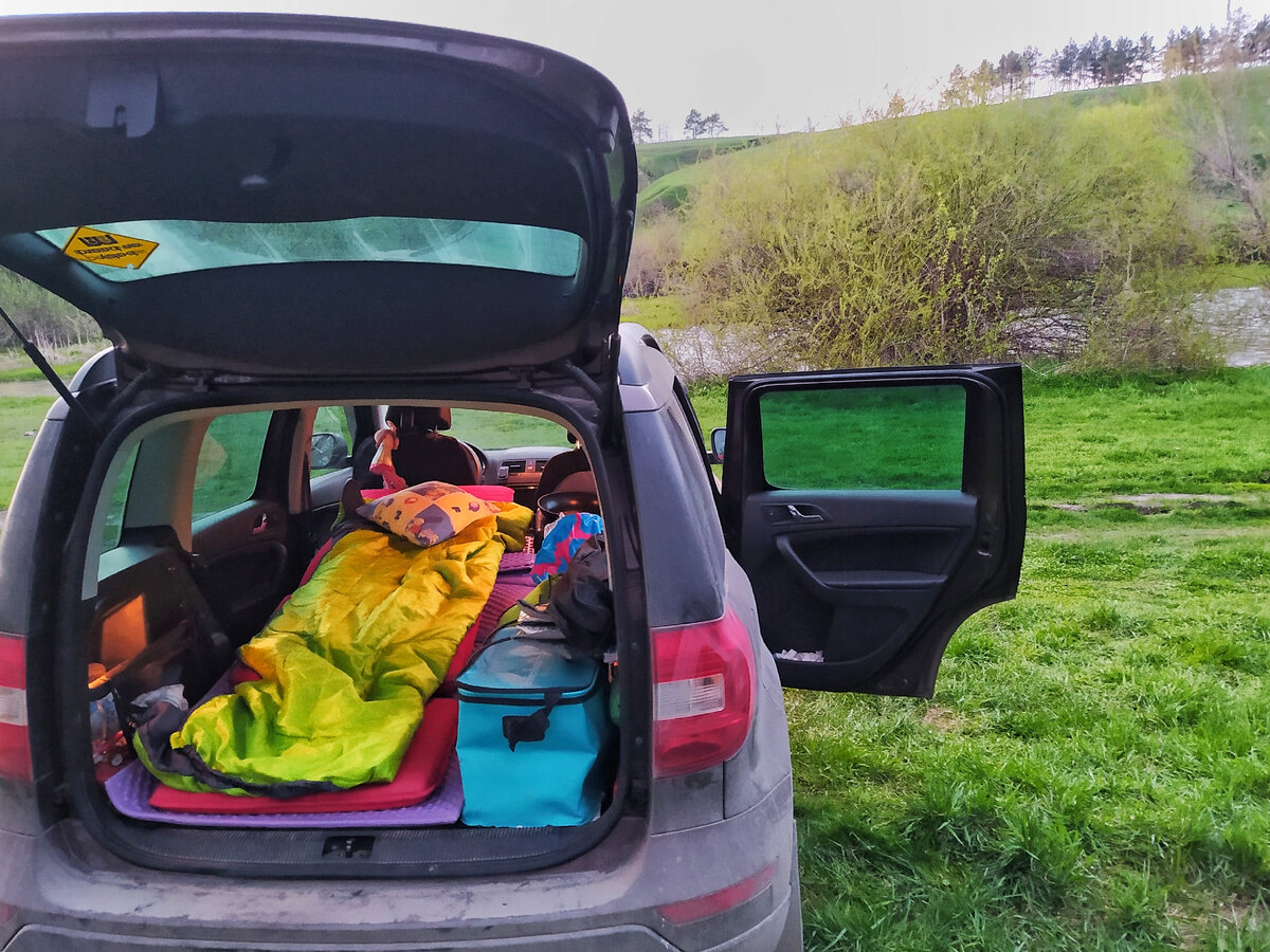 Я спал на ящиках, табуретках, лестничной клетке... Но ночь в машине никогда не проводил. Я, конечно, дремал в машине, но речь не об этом. Решил исправить этот недочет и во время поездки одну ночь я провел я в машине. В Yeti всё для этого предусмотрено: сидения складываются в один уровень с багажником, а полка из багажника аккурат закрывает пространство между передними и задними креслами. Сверху коврики, подушечки, спальник и готово! Я, ростом под 2 метра, прекрасно поместился. Из плюсов: