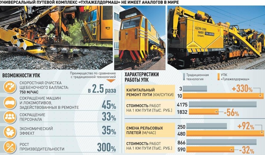В РЖД в свою очередь прекрасно понимают, что существующая технология позволяет ремонтировать на одном участке не более трех километров в сутки, что при наличии 127 тысяч километров российских железных дорог, мягко сказать, недостаточно. Добавьте к этому необходимость перекрывать движение на ремонтируемом участке, и проблема становится тупиковой. А мы же еще хотим высокоскоростное движение наладить, для которого вообще требуется другой железнодорожный путь. Поэтому в стратегии Российских железных дорог как минимум удвоить объемы ремонтов, что сделать без Тульского универсального комплекса просто невозможно. Собственно, поэтому до 2025 года компания и планирует закупить совершенно новой путевой техники на 75 млрд рублей.