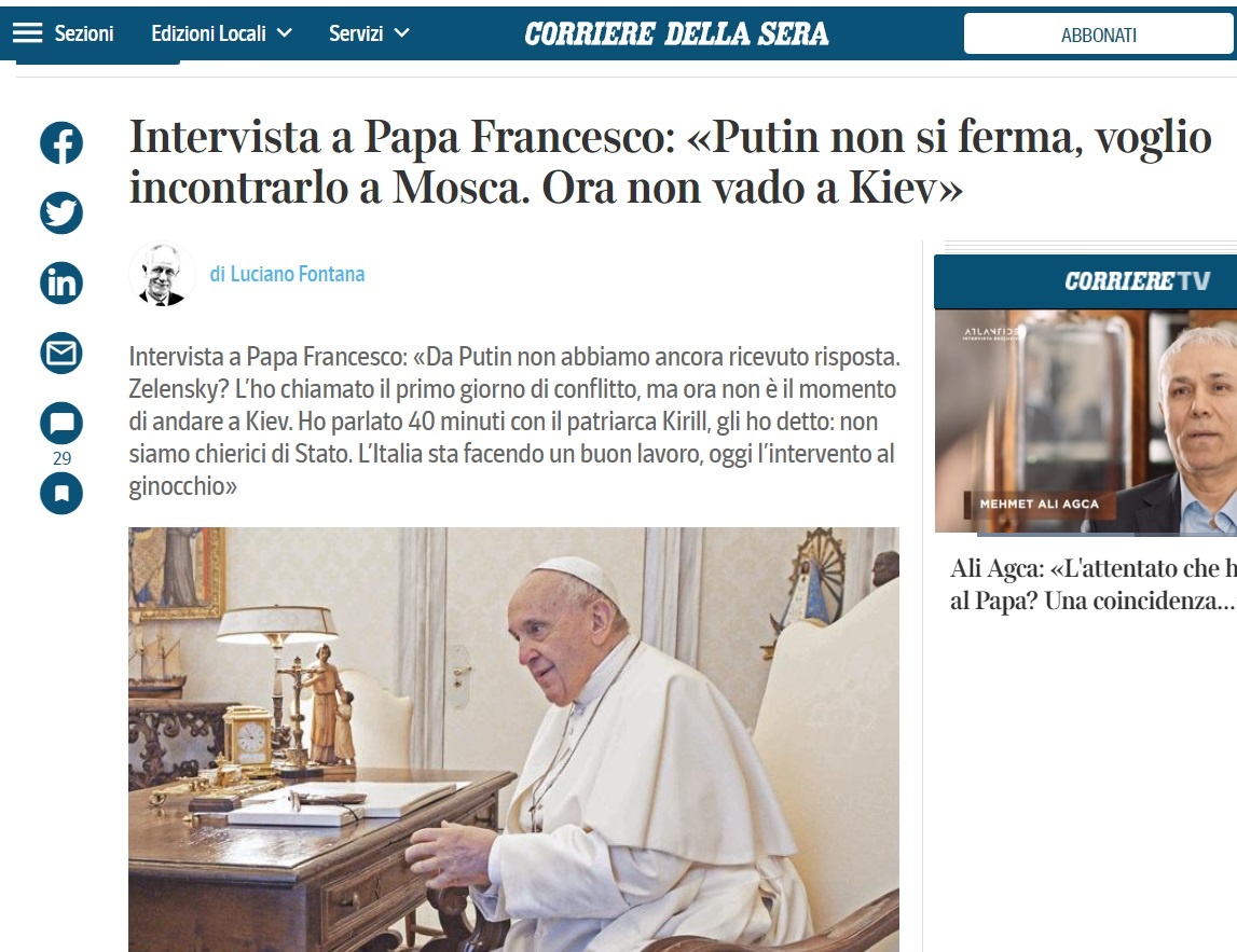 Папа римский Франциск в интервью газете Corriere della Sera, в который раз подчеркнул, что он противник войны и призывает прекратить боевые действия на Украине. Он даже готов приехать в Москву к президенту России, но понимает, что Путин не остановится, и возложил часть вины в этом конфликте на западные страны. Тут понтифик использовал, если мне не изменяет память, цитату из Библии про "лай у ворот". Это стало неожиданностью для многих обозревателей. За главой Ватикана стоит 1,2 миллиарда католиков мира, а в США редкий случай в истории -- страну возглавляет католик, президент Байден, да и спикер Палаты представителей Конгресса США католичка Пелоси.