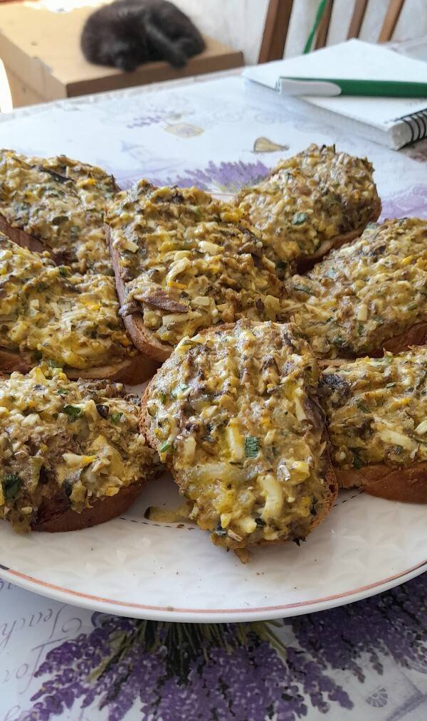 Бутерброды, которые разметаются с тарелки на раз- два! Очень хороший перекус и ссобойка) Ингредиенты: шпрот, небольших маринованных огурца, варёных яйца, майонеза, батона, Небольшой пучок любимой зелени Способ приготовления: Шпроты освободить от масла и размять вилкой. Мелко кубиком порезать яйца и огурцы(я потерла на крупной тёрке). Мелко порезать зелень и добавить к шпротам. Заправить майонезом и перемешать. На куски батона намазать шпротную начинку и выложить на протвинь, застланный пекарской бумагой. Запекать,в заранее разогретой духовке до 180°, 10 минут. Перекус готов! Приятного аппетита!🥰