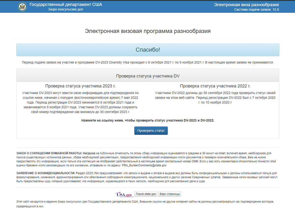 Каждый год около миллиона россиян пытают удачу, заполняя заявки на участие в Лотерее Грин Кард. И 55 тыс. человек из всего мира могут стать счастливыми и упрощенно получить вид на жительство в Америке. Да, шанс выиграть 0,01%, но кто знает... В прошлом году вы заполняли короткую анкету, после заполнения которой вам был присвоен некий номер подтверждения, состоящий из букв и цифр. Вы, конечно же, его записали, и хранили эти 6 месяцев у сердца. Убедитесь, что вы правильно заполнили анкету: указали достоверные данные на тот момент, выписали все именно так, как указано в вашем загранпаспорте. Сайт, на котором можно проверить есть выигрыш или нет, только один - https://dvprogram.state.gov/ . Перед вами появится вот такая страница: Кликайте "Проверить статус". Продолжайте. А теперь доставайте номер подтверждения, и вводите его в первую строку. Вторая строка - имя и фамилия, как было указано в осенней заявке. Заполняйте, и нажимайте "Отправить". Если вы видите короткую запись, то можете да