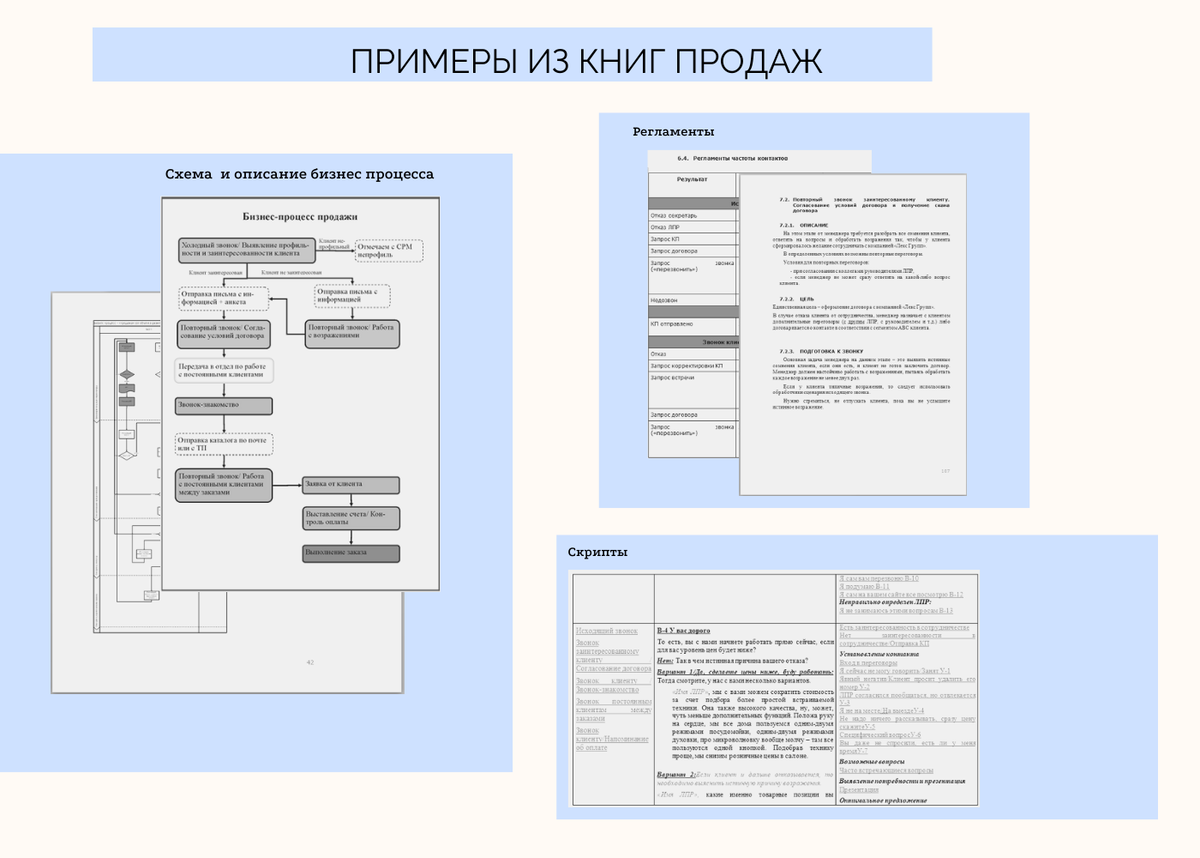 Скрипт продаж, как правило, разрабатывается на определённый этап, чаще всего на одну целевую аудиторию, т.е. конкретный разговор в данной конкретной ситуации. Книга продаж – это сборник всех стандартов и регламентов, которые необходимы для работы менеджера по продажам, в ней собраны различные ситуации, встречающиеся в работе. Благодаря книге продаж, менеджер, который приходит в компанию, понимает какую именно работу ему нужно будет делать: куда звонить и кому, что конкретно говорить этим людям, с какой частотой звонить, какие результаты необходимо получить от звонка. В книге так описываются все этапы бизнес-процесса. В книге обязательно прописан целый блок, который включает в себя методику работы менеджера по продажам и готовые речевые модули. В скрипте продаж только готовые речевые модули, то есть работать по нему может уже подготовленный менеджер. В книге продаж по желанию заказчика добавляется информация о том, какие требования предъявляются продавцу и каким должен быть его внешний
