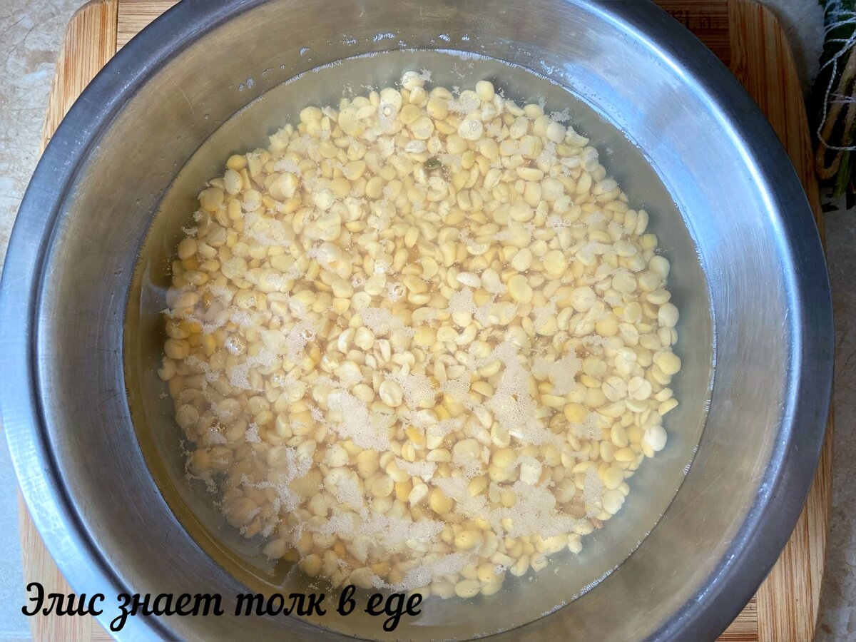 Я очень люблю гороховый суп, но, так получилось, что сама его никогда не варила. Этот суп в нашей семье всегда варит моя мама и он очень вкусно у неё получается, а она любит его готовить. В общем, мама любит варить гороховый суп, а люблю его есть. Сначала необходимо замочить 300г. сухого гороха в воде. Проще всего залить его холодной водой и оставить на ночь. А уже на следующий день можно и готовить суп. Берем свиную рульку, заливаем её водой и ставим на огонь. Тут все как всегда. Доводим до кипения, немного подсаливаем и снимаем пенку. Варим на среднем огне 40 минут. Для этого супа также понадобится около 300г. свиных копченых ребрышек. Ещё одна луковица, одна морковь и мы любим добавлять так называемые «корешки» в бульон (это часть морковки, стебли и корни петрушки и сельдерея, мы их делаем сами, поэтому что это такое и как это делать вы можете прочитать в этой СТАТЬЕ). Через полчаса варки бульона добавляем «корешки» и ребрышки, варим ещё 40 минут. Луковицу мелко нарезаем. А морко