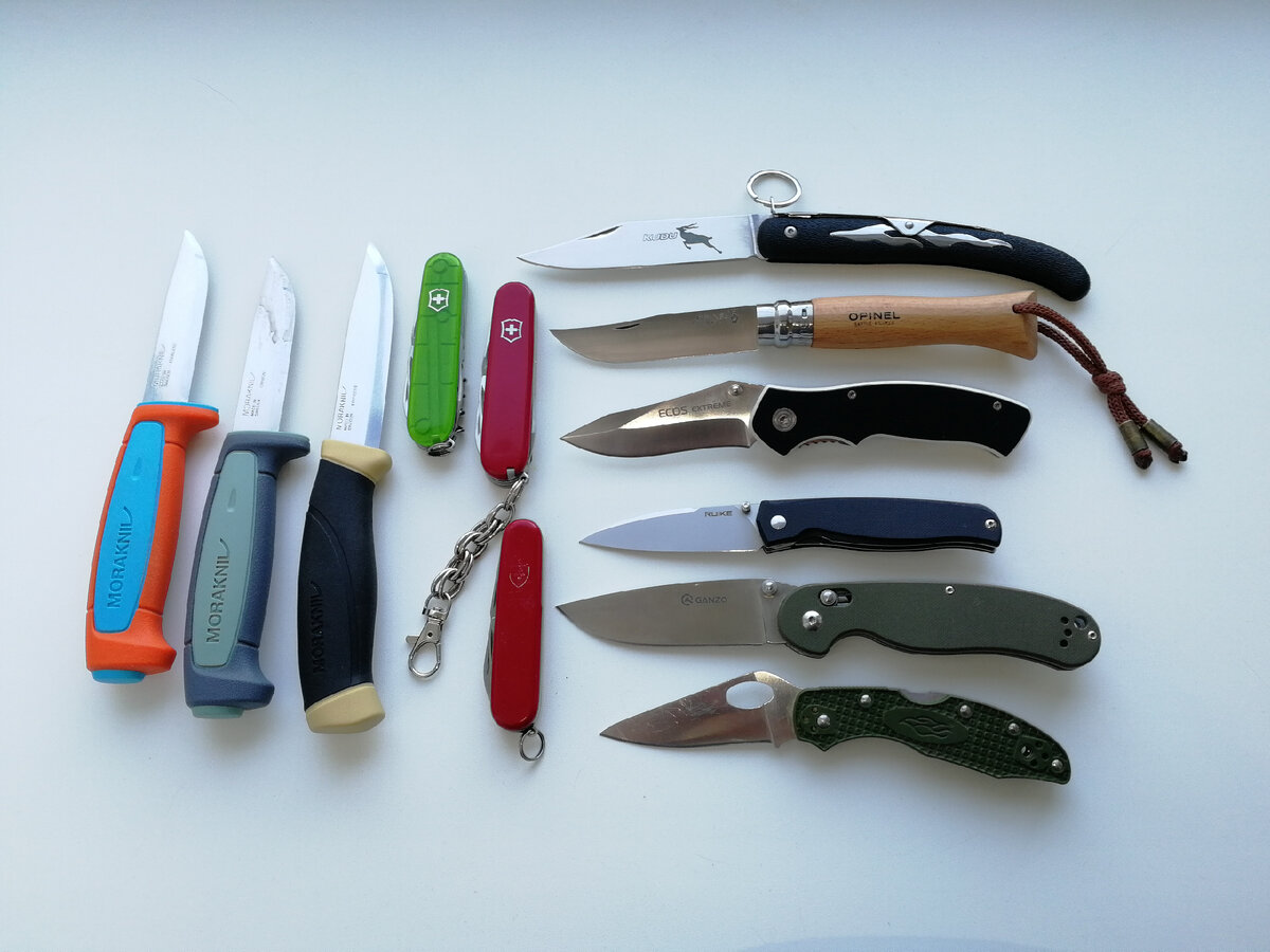 Вот то что накопилось на данный момент. Три ножа от компании Mora 546, 511 лимитированные версии 2018г и 2022г ну и Мora Companion. Классика что тут еще сказать))) Ну компаньон из них конечно самый удобный у него прорезиненная рукоять и в ножнах он сидит надёжней плюс клинок подлиннее. Три ножа VICTORINOX. Spartan, Recrut и Hiker Victorinox recruit 84мм.(средний на фото) Ножик простой по своему функционалу. Всего два лезвия и две открывашки. Но интересен он тем что это ранняя модель примерно 1975-1980 годов выпуска. Spartan 91мм в редком зеленом цвете с прозрачными плашками, лимитка продавался в наборе с небольшим кухонным серрейторным ножом. Victorinox Hiker 91мм один из самых функциональных из них в нём есть и крестовая отвертка вместо штопора и пила. Далее два ножа Ganzo 727m и 759m одни из самых любимых у меня ножей на данный момент. Лёгкий, компактный и надежный 759 и очень удобный 727 онже Ганзо-крыса почти копия Ontario rat1 только с замком аксис лок. Далее Cold steel ku