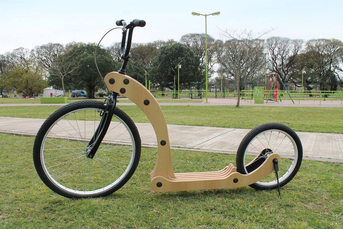 Diana Saramaga, Jose M. Fisicaro и Daniel Castillo - создатели самоката INKA, ставшего призёром аргентинской выставки проектов INNOVAR 2015. Каждый год она проводится в выставочном комплексе "Технополис" столицы страны - Буэнос-Айресе. Аргентинские товарищи пошли «своим путём» и разработали наборную конструкцию. Рама самоката собирается на винтах, из фанерных заготовок. Предусмотрена даже "нычка" для мелочёвки. Стакан под рулевую колонку – металлическая конструкция, к деревянной части крепится винтами, задние перья тоже усилены металлическими пластинами. Весьма симпатичная конструкция, но вот щели в этом наборе мне совершенно не нравятся – будет забиваться всякая «бяка», а прочистить узкую щель – problema grande, как говорят в Аргентине. Это раз. Два - слишком толстая дека, прыгать утомительно. Я думаю, толщина взята с запасом, для прототипа Жаль, что дальше дело не пошло – последняя запись в мордокниге датирована 2016 годом, электронная страница, указанная на записи в YouTube не от