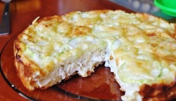 Ингредиенты: Вареное куриное филе — 300 г Мука ц/з-ая— 50 г Яйцо (некрупное) — 2 шт. Молоко — 150 г Сыр твердый низкой жирности — 50 г Разрыхлитель — 1/2 ч. л. Приправы (черный перец, карри, итальянские травы) — по вкусу Соль — по вкусу Можно добавить кабачки Приготовление: 1. Куриное филе мелко нарезаем. 2. Взбиваем яйца с солью и молоком, добавляем муку, разрыхлитель и приправы, таким образом получается негустое тесто. В тесто перекладываем кусочки курицы и натертый на терке сыр. Хорошо размешиваем и перекладываем в форму для выпечки. 3. Выпекаем пирог в разогретой до 200 градусов духовке около 35–40 минут (до золотистой корочки). Приготовить такой пирог можно не только в духовке, но и в мультиварке.