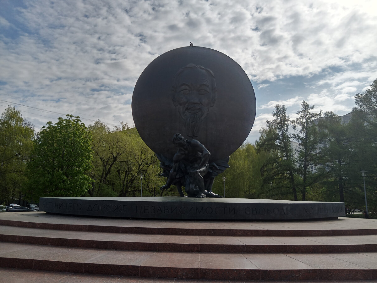 Памятник Хо Ши Мину в Москве — скульптурный монумент, установленный в честь вьетнамского политического деятеля Хо Ши Мина в Москве на одноимённой площади в Академическом районе города. Памятник был открыт 18 мая 1990 года. Памятник выполнен из бронзы и камня и представляет собой портрет вьетнамского политического деятеля Хо Ши Мина на фоне символического солнца. Перед диском солнца установлена скульптура вьетнамца, который поднимается с колен. С обратной стороны солнечного диска находятся тропические цветы и два бамбуковых дерева. Композиция установлена на круглой плите. На пьедестале начертаны слова Хо Ши Мина: «Нет ничего дороже независимости, свободы». Авторами памятника являются скульптор В. Е. Цигаль и архитектор Р. Г. Кананин. #2022 #россия #москва #памятник #история #пешком #чтопосмотреть #прогулка #интересное #информация