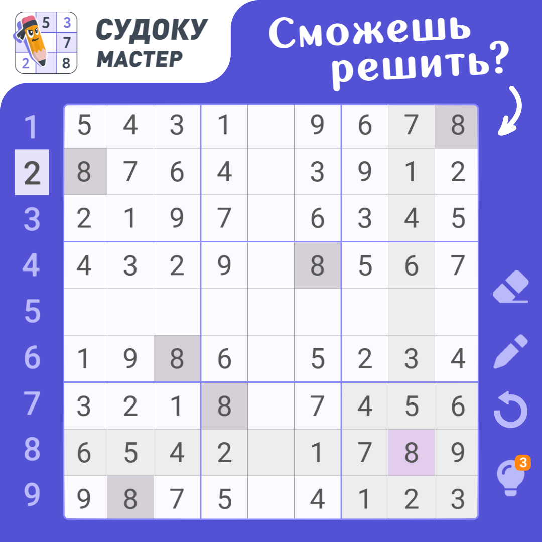Пора поломать голову над задачкой! Изучайте картинку, а затем запишите все числа в игровом окне. Если вам понравилась задачка, то можете подписаться на канал, чтобы получать новые судоку каждый день.