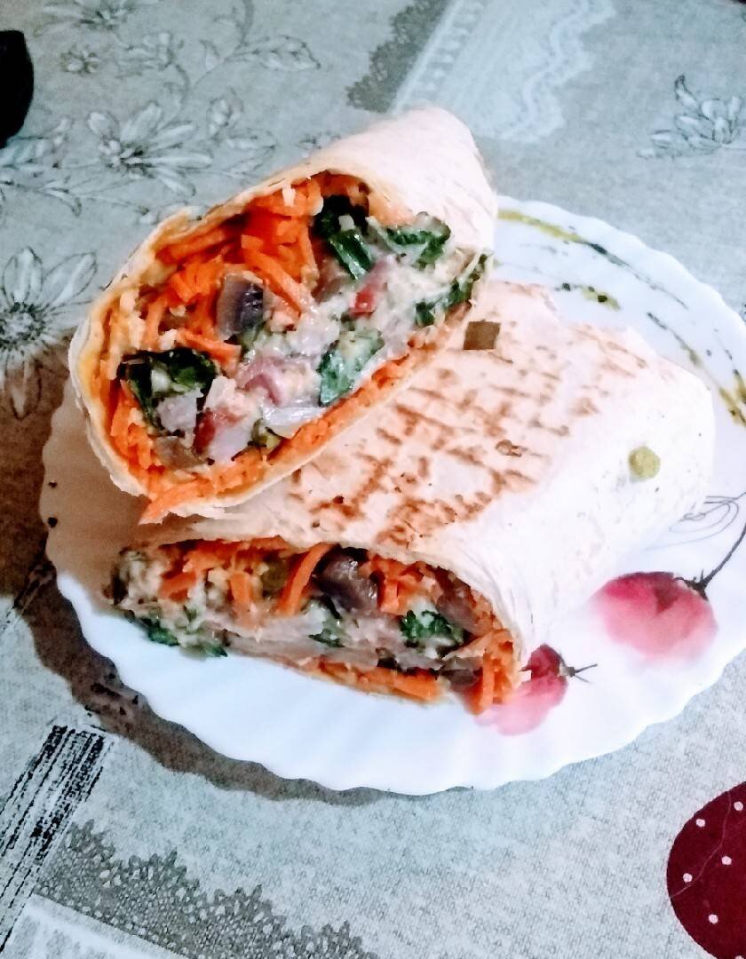 Ингредиенты: тонкий лаваш армянский, моркови корейской, маринованных грибов, куриного мяса, Зелень лука, петрушки, кинзы, сыра, помидора, майонеза, оливкового масла, пряные травы (специи) Способ приготовления: Подготовьте все ингредиенты. Смешайте майонез, травы и оливковое масло. Грибы, мясо и зелень нарезать кубиками, помидор помыть и нарезать тонкими кружочками. Корейская морковь в данном случае готова. Сыр натереть на тёрке. Собираем нашу шаурму. На лист лаваша с одной стороны выложить морковь и немного сыра, затем грибы и сыр. Далее мясные продукты, зелень, сыр и томаты,вновь сыр и соус. Свернуть лаваш загибая концы во внутрь,как блин. Разогреть сковороду и на сухой сковороде подарить шаурму до румяной корочки с двух сторон. Приятного аппетита 😊