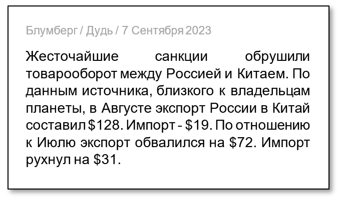 Россия и Китай стремительно обрезают американским банкирам доступ к данным о своих экономиках и союзном товарообороте. И это правильно. Мы не должны рассказывать врагам о своих делах. Если банкиры захотят получить данные, то должны будут покупать предателей и засылать шпионов. А мы будем их ловить и вешать. Так будет работать мировая экономика через год - в разных частях глобуса экономика будет своя. Привыкайте к новой реальности. Через год Блумберг разразится "сенсацией": Естественно, журналисты растащат эту новость по пустым головам долларовых папуасов, а те поднимут страшный вой: КИТАЙ НАС БРОСИЛ! КИТАЙ СЛИЛ РОССИЮ! АААА! ПОРА ВАЛИТЬ!!!