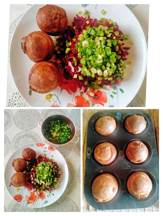 ✓ Масло растительное рафинированное. Молочно-яичную субстанцию доводим до однородности погружным блендером. Добавила соль, муку, немного перемешала вилкой и довела до абсолютного совершенства блендером. Оставила на 20 минут. В это время включила духовку на 150С и отправила нагреваться формочки. Через 10 минут достала, налила в каждую формочку примерно по чайной ложке масла и ещё на 10 минут в духовку. Затем в горячие формочки с маслом наливала это блинное тесто примерно до половины. Получилось 12 штук. И отправила в духовку, но температура уже 230С. Не открывать ни в коем случае!