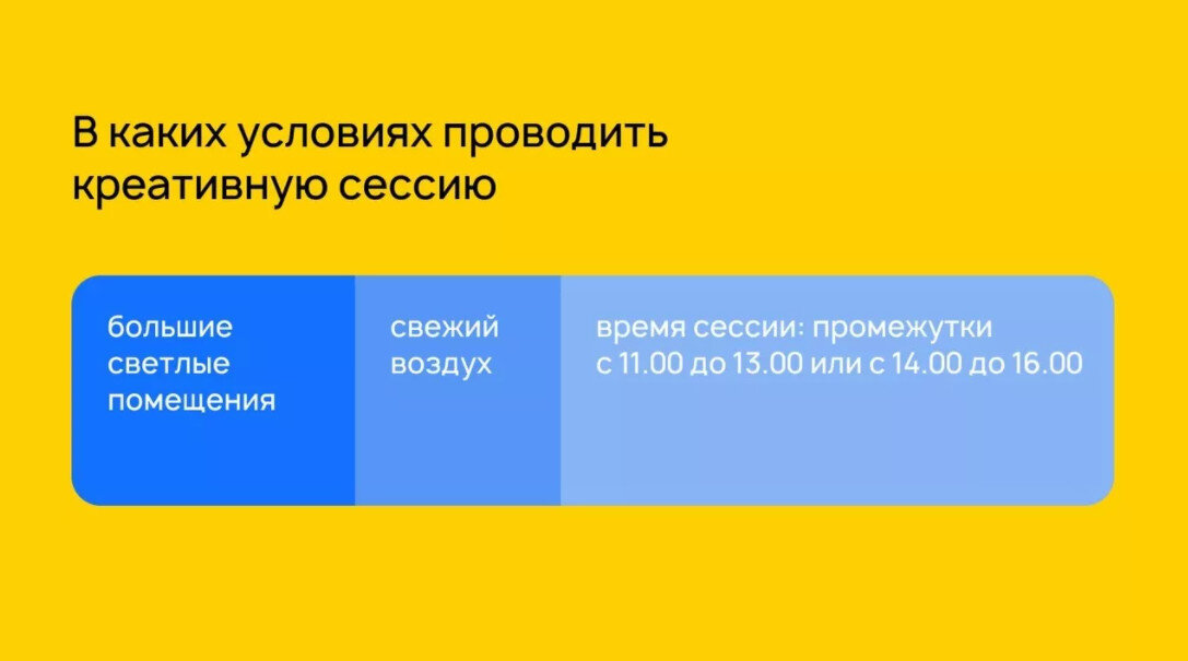 Первое, на что стоит обратить внимание ещё до начала проведения креативной сессии ― место и время собрания, потому что её итоги во многом зависят от комфорта участников.