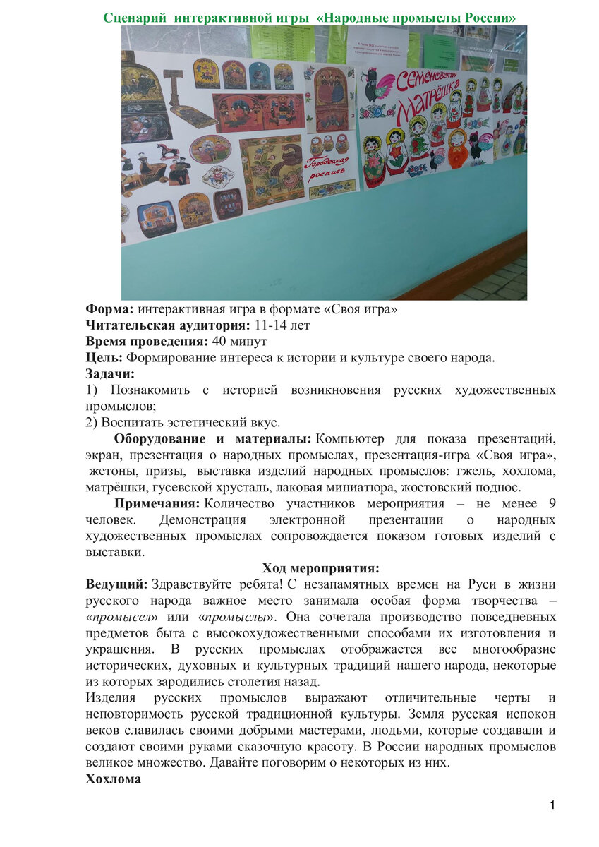Сценарий интерактивной игры "Народные промыслы России" в формате "Своя игра".