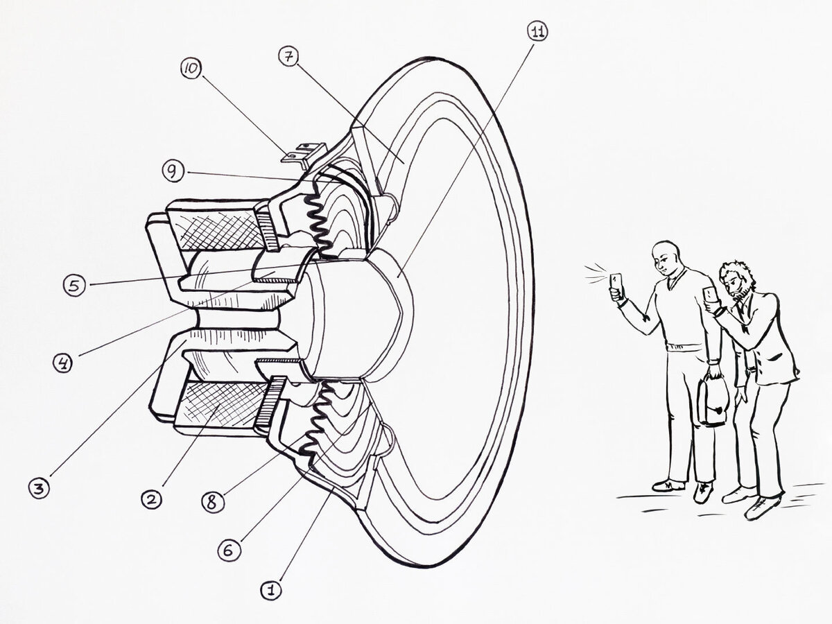 Любой современный динамик включает в себя каркас [1], который еще называют корзиной или даже пауком. На нем держатся все остальные части конструкции.