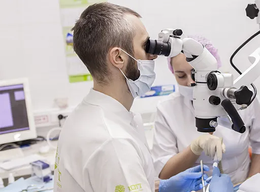 Микроскопы, применяемые в стоматологии, имеют тридцатикратное увеличение, а также обеспечивают очень хорошее освещение рабочего поля, благодаря чему существенно повышаются точность и качество проводимого лечения. Микроскопы применяются в терапии, ортопедии, хирургии. Особенно востребовано применение микроскопа при лечении кариеса, пульпита и периодонтита. Преимущества Высокая точность при проведении диагностики. Позволяет выявить кариозное поражение тканей зуба на ранней стадии, мелкие дефекты и нарушения прилегания пломб, реставраций. Позволяет точно определить пораженные участки и провести их щадящее удаление, не затрагивая здоровые ткани. Позволяет обеспечить герметичность и точное прилегание при пломбировании зубных каналов, кариозных полостей, установке реставраций. Применение Эндодонтия – лечение корневых каналов зуба Микроскоп эффективно применяется при лечении и перелечивании каналов зуба. Диаметр канала зуба в среднем 1 мм, кроме этого зубные каналы имеют изгибы, что существен