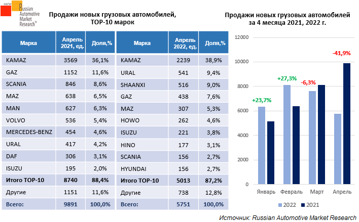 Согласно данным Russian Automotive Market Research за первые четыре месяца 2022 г. было продано 27,9 тыс. новых грузовых автомобилей, в прошлом году за 4 месяца было реализовано 29,6 тыс. грузовиков, рынок сократился на 5,7% по сравнению с аналогичным периодом прошлого года. В марте текущего года продажи новых грузовиков снизились на 6,3%, а в апреле - почти на 42%. По итогам апреля в ТОР-10 из «европейской семерки» попал только один бренд – SCANIA. В апреле прошлого года 5 брендов из «европейской семерки» вошли в ТОР-10. https://napinfo.ru/infographics/za-pervye-4-mesyatsa-prodano-27-9-tys-gruzovikov/ Пожалуйста, оцените эту статью и подпишитесь на канал или поделитесь ссылкой на него в социальных сетях, если считаете его интересным.