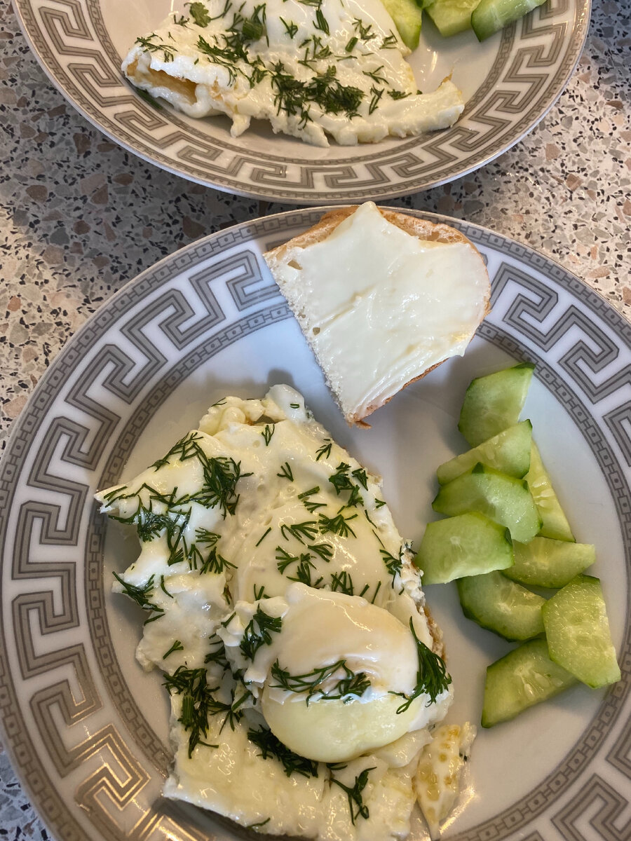 - На завтрак у нас были жареные яйца. Я доела ещё овощной салат с ужина.