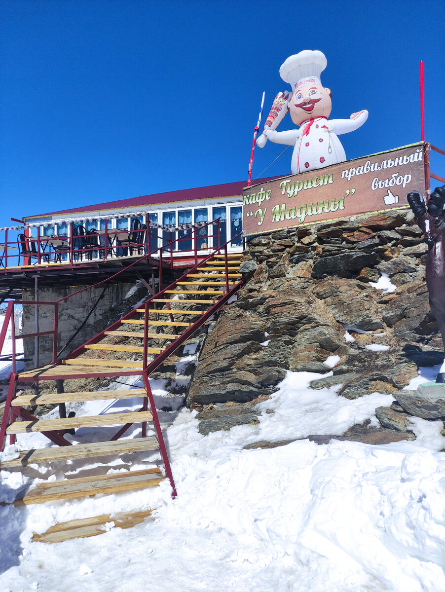 Кафе "У Мадины", расположенное на высоте 3008 метров, в нескольких метрах от предпоследней остановки канатной дороги, нам посоветовал экскурсовод. И хоть внешне заведение выглядело неказисто, мы к тому моменту были такими голодными, что было абсолютно всё равно, чем пообедать. Меню и интерьер Громадный плюс заведения - наличие открытой веранды с потрясающим видом на горы Домбая. Впрочем, в мой визит в апреле, был такой холод, что на веранде не сидел ни один человек. Все грелись внутри. Внутри кафе в стиле советской столовой для дальнобойщиков😊. Скатерти с дешёвой клеенкой, ободранные кожаные диванчики и портрет молодого Путина на фоне бабушкиных синих ламбрекен с белой бахромой. Из позитивного - даже внутри из панорамных окон открывался живописный вид на горы. Заказ надо делать на кассе (оплата, соответственно, сразу), там висит и меню. Блюд в ассортименте немного, кухня представлена преимущественно кавказкая. Цены как в ресторанах Кавминвод, совершенно не сочетаются с убогим интерьер