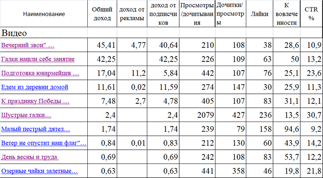 Я выбрала несколько видео, статей, постов - от высшей оплаты и ниже за месяц. Собрала в таблицу все показатели. И что толку - никакой логики в начислении дохода я не уловила.