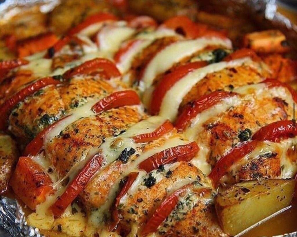 ✅КБЖУ: 69.39/6.91/3.23/3.21 Ингредиенты: ▫️2 филе грудки индейки (~700 г) ▫️10 мл оливкового масла ▫️200 г помидор ▫️50 г сыра ▫️50 г шпината ▫️Паприка, соль, перец, чеснок и травы по вкусу. Соевый соус ▫️Любые овощи (морковка, лук и помидоры, картофель) Приготовление: ▫️маринад:смешать паприку, соль, перец, соевый соус, добавить чеснок ▫️Грудки промываем, отжимаем лишнюю жидкость и делаем параллельные надрезы по все длине филе на расстоянии ~2см друг от друга ▫️Промазываем грудки маринадом, нарезаем помидоры кружочками, сыр-полосками, а шпинат просто измельчаем ▫️Закладываем в каждый надрез шпинат, затем помидорки и сыр, выкладываем на подушку из овощей(овощи посыпать специями и полить оливковым маслом) ▫️Накрываем форму фольгой, запекаем в духовке при 200* около получаса, затем снимаем фольгу, сбавляем температуру до 180 градусов и держим ещё 15 минут.