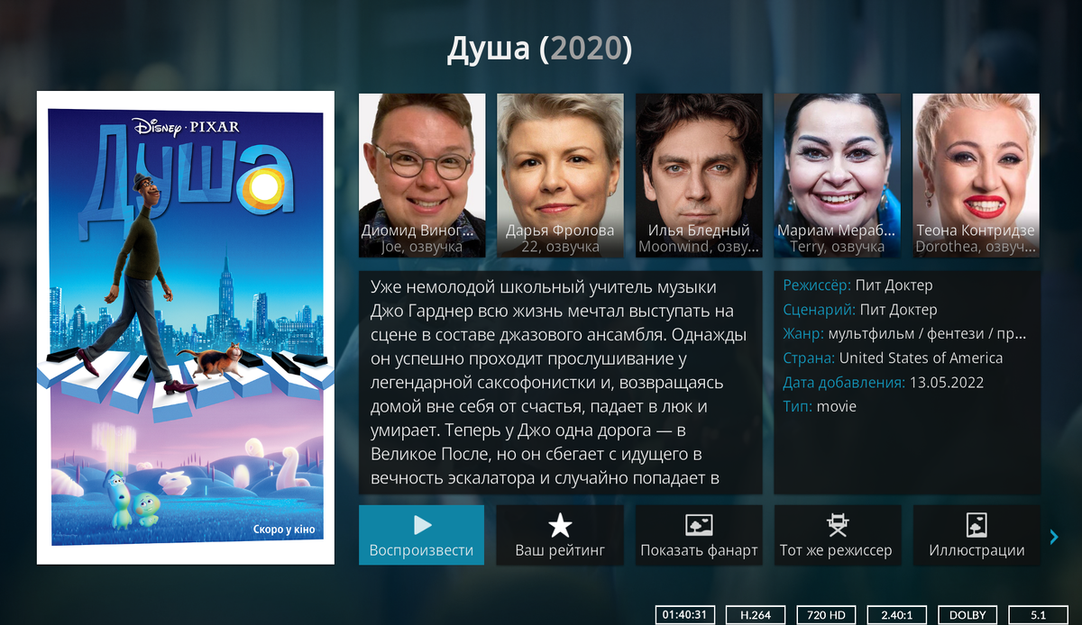 На примере мультфильма Душа 2020 года. Для того, чтобы вручную добавить описание к фильму в медиацентре Kodi я выполняю ряд обязательных действий: Все, заранее подготовленные файлы должны находиться в одной директории (или папке, кому как привычнее). Описание и картинки я привык брать с сайта Kinopoisk.ru. Вся информация о фильме находится в файле .nfo, который необходимо создать самостоятельно. Пример файла nfo для мультфильма "Душа": <?xml version=1.0 encoding=UTF-8 standalone=yes ?> <movie> <title>Душа</title> <originaltitle>Soul</originaltitle> <director>Пит Доктер</director> <credits>Пит Доктер</credits> <country>United States of America</country> <genre>мультфильм</genre> <genre>фентези</genre> <genre>приключения</genre> <plot>Уже немолодой школьный учитель музыки Джо Гарднер всю жизнь мечтал выступать на сцене в составе джазового ансамбля. Однажды он успешно проходит прослушивание у легендарной саксофонистки и, возвращаясь домой вне себя от счастья, падает в люк и умирает. Теп