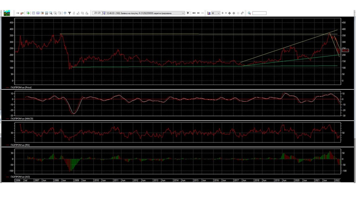 Настоящие время акция Газпрома делает попытку остановить просадку, даже сделать попытку развернуть акцию Газпрома. Хотя бы на технический отскок, если не получится создать растущий тренд, создается ситуация на продолжение движение вниз. Также надо учитывать осталось меньше двух месяцев по выплатам дивидендов своим акционеров. Также многие аналитики брокерских компаний, например: банка Tinkoff, Finam, BCS, сайт РБК дают разный анализ по выплатам дивидендов. Одни говорят дивидендов не будет, другие говорят будут, чтобы не гадать нам, советую дождаться 30 июня 2022 года, где будет сказана, будут платить дивиденды или не будут, также нам скажут о размере выплат дивидендов. Если решение будет принято по выплатам дивидендов, пока давайте рассмотрим движение акции Газпрома на основание технического анализа до конца мая. Месячный график нам показывает, акция Газпрома продолжает движение вниз с попыткой сформировать две небольшие ноги. Индикаторы показывают тоже такую попытку, но еще продолжаю