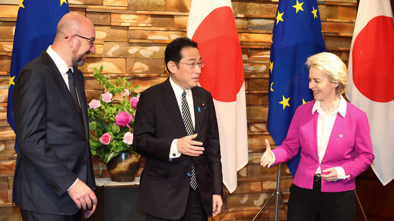 В Токио состоялся саммит Японии и ЕС. Стороны договорились усилить давление на Россию и противостоять экспансии Китая в Южно-Китайском и Восточно-Китайском морях. Евросоюз хочет играть большую роль в Азии, где, по мнению двух его представителей, нарастает напряженность из-за все более напористой политики Китая. Тройка переговорщиков, как передало Reuters, решила максимально укрепить взаимодействие против России в таких областях, как энергетика и оказание помощи Украине. Кисида ранее пообещал «в принципе» запретить ввоз российской нефти, но не пожелал уходить из «некоторых других совместных с Россией проектов». Что на самом деле имел в виду японский премьер, раскрыла газета Japan Times. Присоединившись к решению G7 отказаться постепенно от российской нефти, Япония останется участником двух проектов по добыче нефти и производству сжиженного газа на Сахалине. Джеймс Браун, политолог в Университете Temple в Токио, говорит, что, хотя на российскую нефть приходится маленькая часть импорта, о