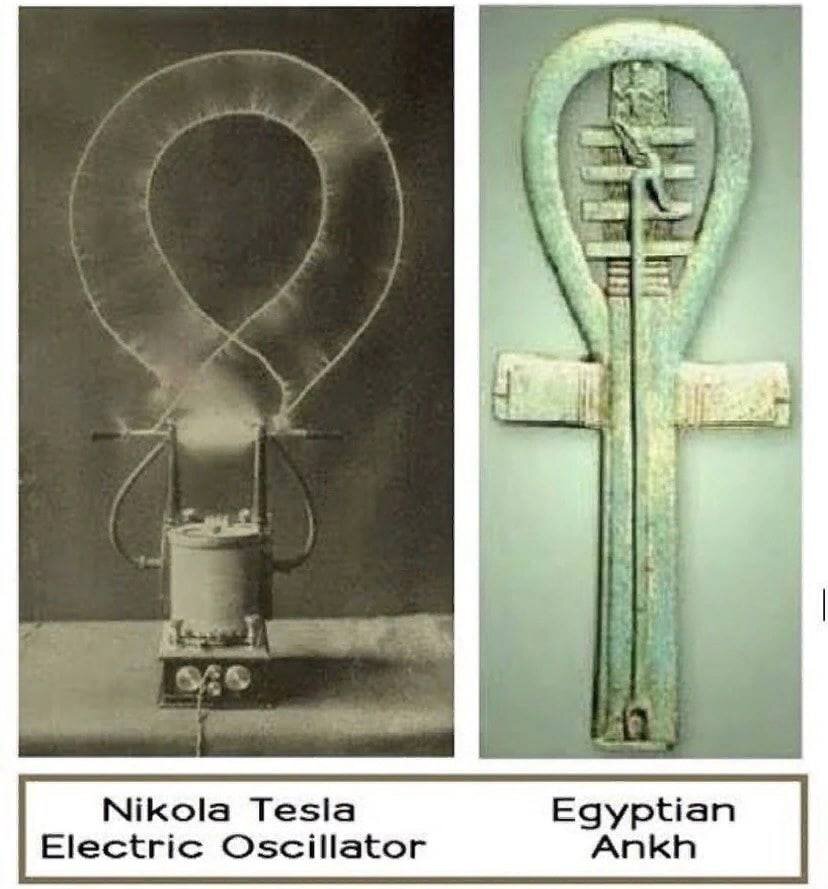 Анкх и изображение катушки Тесла схожи Анкх - известный египетский знак. Слева находится изображение устройства катушки Тесла с плоским индуктором и верхним расположением индуктора. Египтяне не пририсовывали богам абстрактные символы жизни или силы, а представляли общественности реальные технические устройства.
