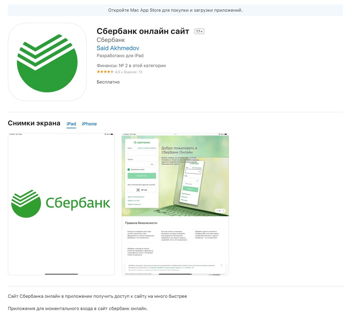 На самом деле история неоднозначная. Владельцы смартфонов на Android подкалывают любителей iPhone, которые часто любят хвалиться, что в App Store нет вредоносных приложений в отличие от Google Play Store, где их хватает, и потому проходят регулярные чистки. В этот раз неоднозначные приложения появились именно в App Store. Многие уже окрестили их мошенническими, но при этом платформа сообщает, что приложение не ведёт сбор данных. Потому, вероятно, приложение, просто неофициальное, что ещё не означает мошенничество. Однако, мы никогда не рекомендуем использовать неофициальные банковские приложения во избежание любых неприятных ситуаций. Ведь поведение приложения может измениться, к примеру, с очередным обновлением, когда оно уже завоевало ваше доверие. Такие новости мы постоянно публикуем в Telegram. Подписывайтесь на канал, чтобы ничего не пропустить ;) Разработчиком указан некий Саид Ахмедов, у которого в портфолио в App Store есть ещё два приложения: AIBackground и Обратный отчет Widg