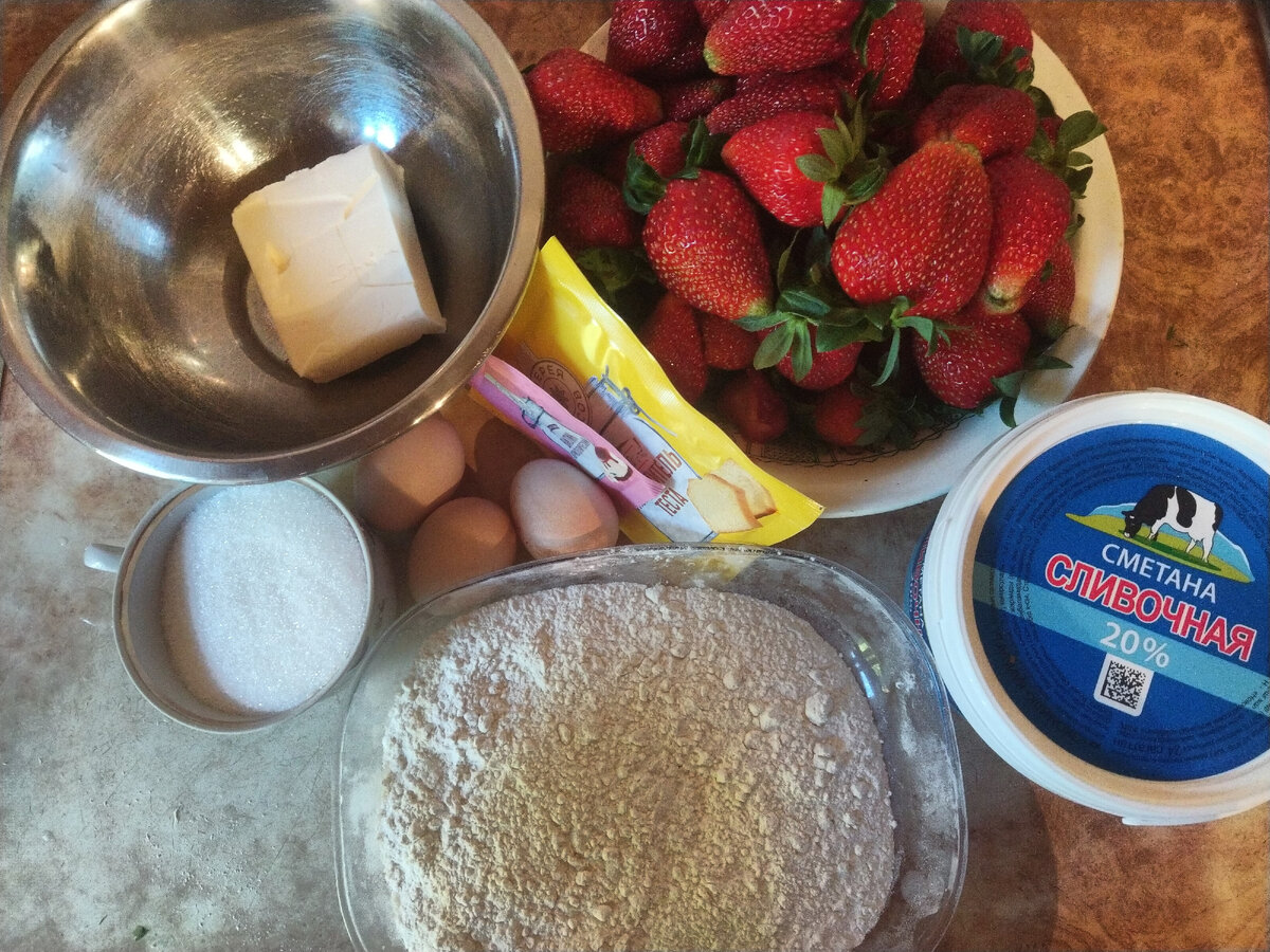 Клубнику нарезаем. Размер зависит от предпочтений. Если нарезать очень мелко - клубника почти растворится. Тесто вынуть из холодильника и руками распределить по форме, обязательно сформировать бортики. На тесто выкладываем клубнику.