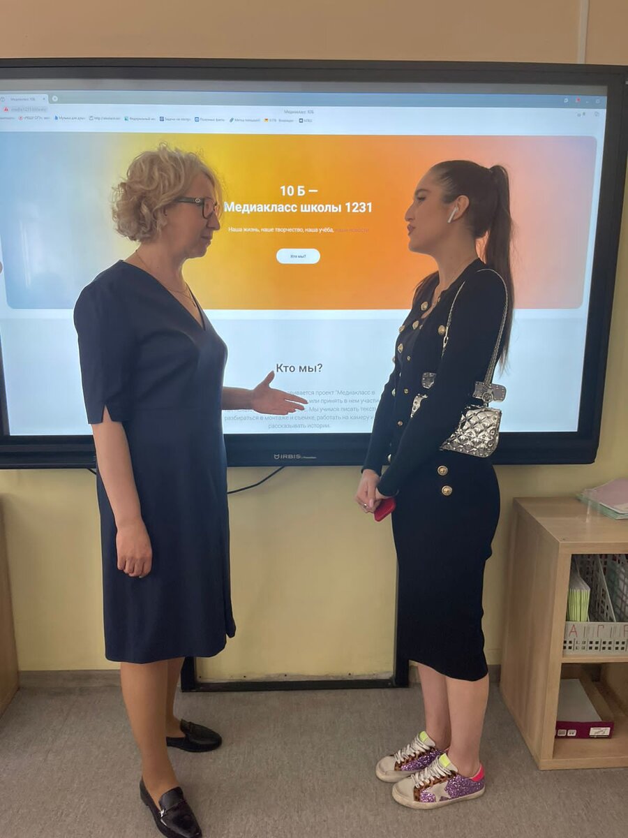 🤗День медиакласса для будущих его учеников начался со знакомства с медиастудией школы, показа отличного интервью, 📽 снятого Архипом Потаповым с использованием 🟩 хромакея, и замечательной проектной работы Христины Васильевой 🎶 «Музыка арбатских улиц». Было наглядно продемонстрировано, что может получиться, если упорно трудиться над своей проектной, да и просто любой творческой работой в медиаклассе, владея технологиями и необходимыми навыками создания медиапродукта. 📹После представления работ девятиклассникам рассказали обо всех преимуществах поступления в медиакласс и ответили на все интересующие их вопросы, гости смогли познакомиться с куратором школьной медиастудии 👩🏫 Натальей Александровной Ежовой, специалистом Высшей школы телевидения МГУ. 📰Следующим этапом знакомства с медиаклассом был стендовый рассказ Ольги Кулишенко, Марии Березовской и Айгизы Кунаккужиной о газете «Московское время 12:31». Каждому из гостей выдали уменьшенную версию газеты с QR кодом, с помощью котор