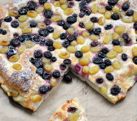 Для теста: 350 г муки высшего сорта, 30 г свежих дрожжей, 1 чайная ложка сахара, 4 столовые ложки оливкового масла, 1 щепотка соли Для начинки: 500 г черного винограда без косточек, 500 г белого винограда без косточек, 140 г сахарного песка, 40 г растопленного сливочного масла Тесто: 1. Просеять немного муки в большую миску. Рукой сделать по центру углубление в виде воронки. Аккуратно всыпать в него раскрошенные дрожжи. Добавить к ним сахар, 125 мл воды и все перемешать. Накрыть чистым кухонным полотенцем. 2. Поставить опару в теплое не продуваемое место и дать ей подойти, чтобы объем увеличился вдвое, а на поверхности появились мелкие трещинки. 3. Добавить к опаре оливковое масло, соль и 125 мл воды. Всыпать остаток муки и перемешать все с помощью специальной насадки миксера. Вымесить эластичное тесто. Разделить тесто на две части и раскатать обе по размеру противня. Начинка: 1. Отщипнуть ягоды винограда от веточек и тщательно промыть их. Дать стечь каплям воды. Посыпать сахарным песк