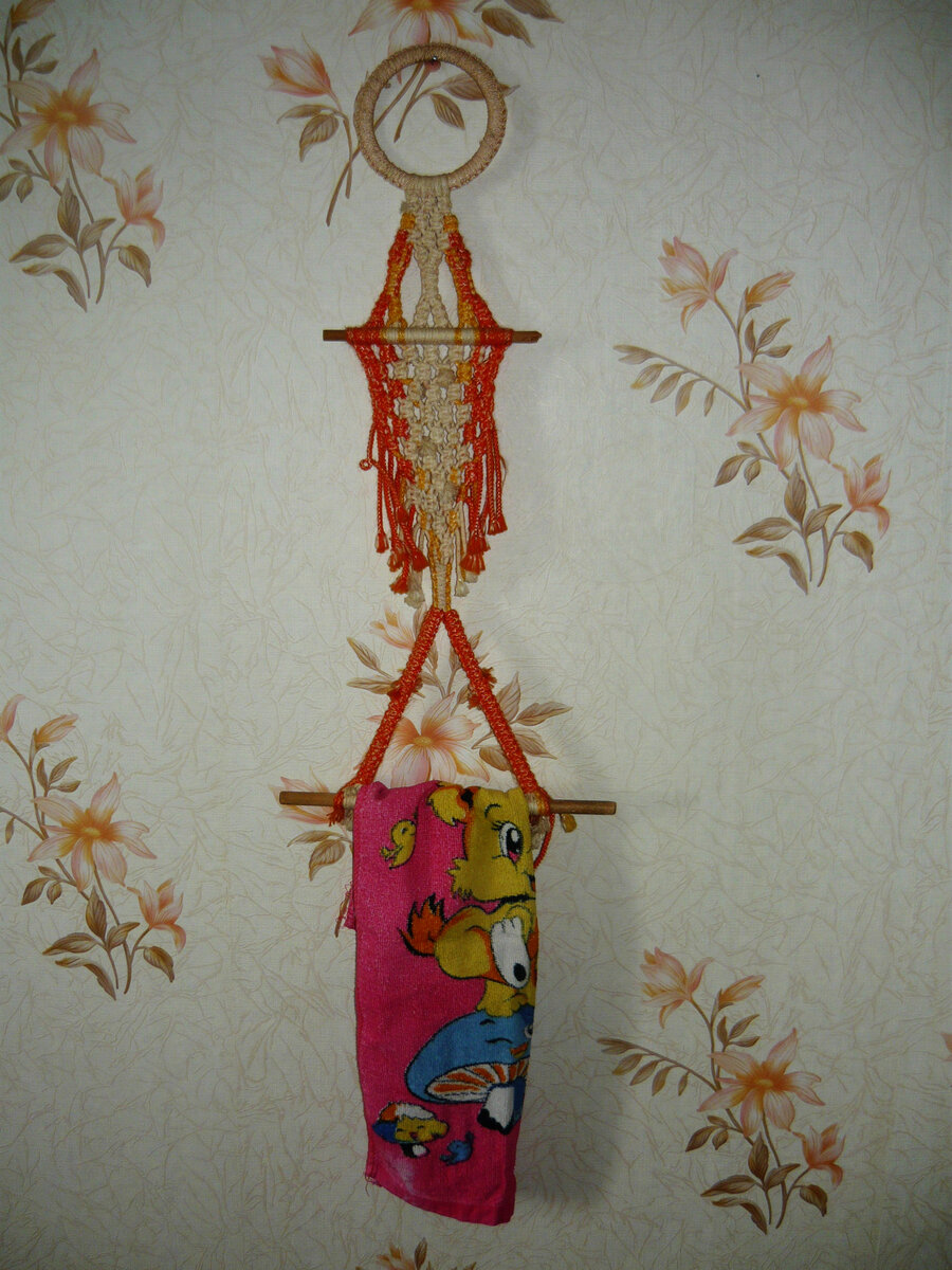 Куда пристроить #полотенце в ванной или на кухне? Вариантов много: гвоздик, крючок, полочка, ящичек, шкафчик, либо просто комок, небрежно брошенный хозяевами. А можно срукодельничать более сложную приспособу – держатель, он же #вешалка, для полотенец. Выполнена вещица в технике плетения макраме. Ее легко сделает даже начинающий осваивать азы этого рукоделия. Да, "начинающИЙ" – знаю нескольких мужчин, которые увлекались плетением макраме, и у них очень даже здорово получалось.