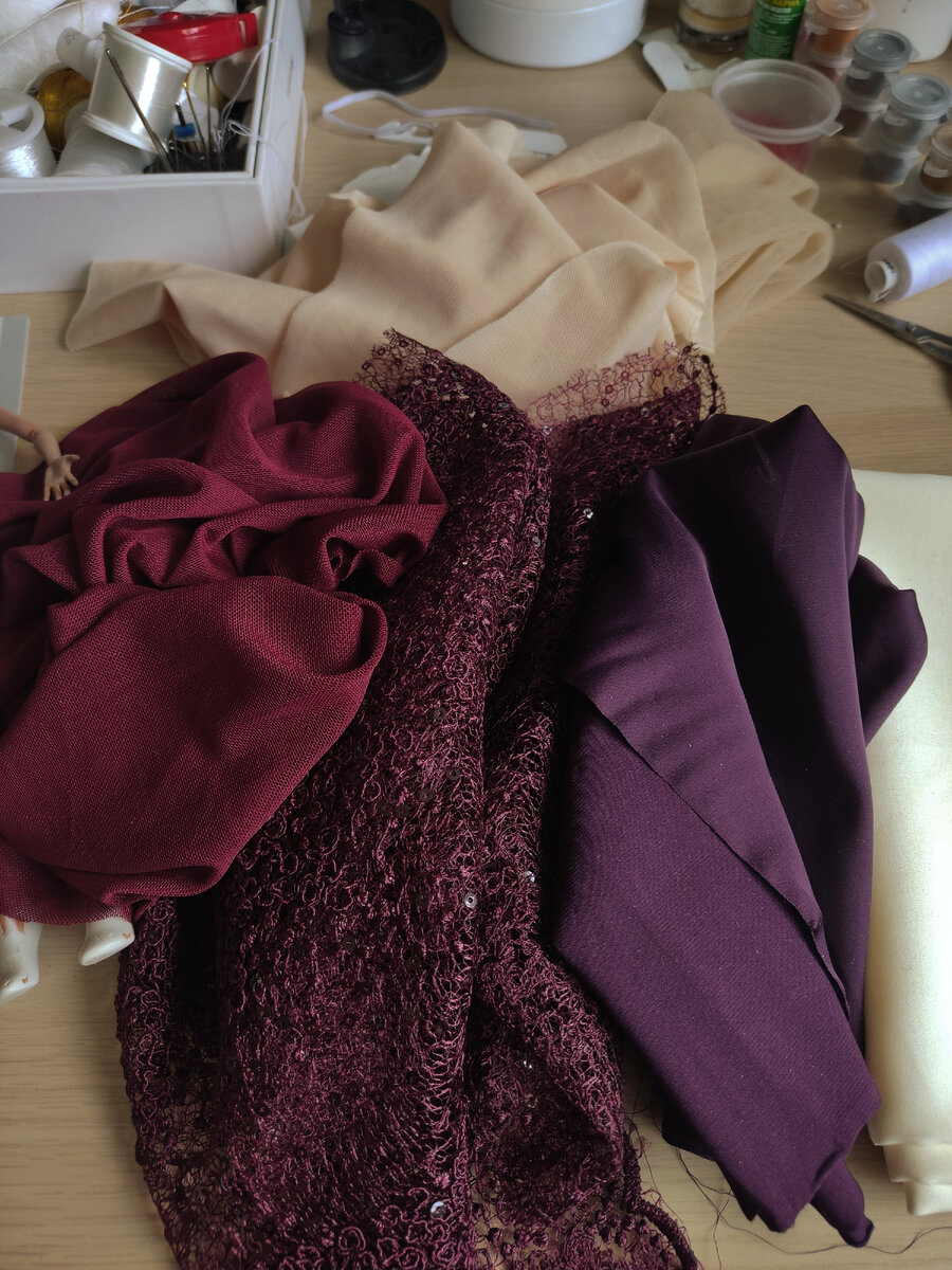 Всем привет! Меня зовут Александра, и я увлекаюсь преображением (ООАКом) кукол Monster High и Ever After High. Продолжаю рассказывать о преображении Клео в фигуристку. На очереди костюм. Или это платье? Честно признаюсь, я не знаю, как правильно, по фигурному. Мастера, работающие с куклами, чаще всего называют это аутфитом. Или нарядом, кому как больше нравится. Костюм будет в бордовых тонах, а вдохновеньем послужил один из реальных нарядов спортсменки. Конечно, в таком маленьком кукольном формате не реально повторить наряд человека, но в этом же стиле сделать вполне возможно. Платье довольно сложное в исполнении, поэтому, увлёкшись, фото я почти не делала. Корсаж, как обычно, на основе высушенной салфетки и ПВА. И обтянут бордовой мягкой сеткой. Сверху в хаотичном порядке нашито кружево На спине глубокий вырез. Рукава из той же сетки и кружева. И тройная юбка. Юбку, кстати, я переделывала 4 раза - никак не хотели укладываться красиво эти три крохотные кусочка ткани. Чаще я де