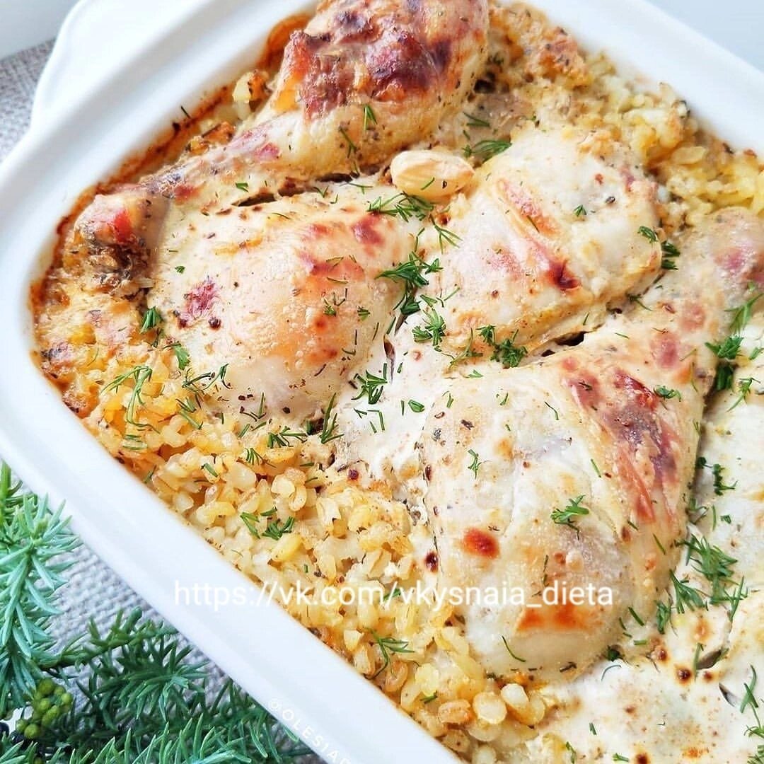 БУЛГУР С КУРИНЫМИ ГОЛЕНЯМИ В ДУХОВКЕ. Итого на 100 грамм 192 ккал Б/Ж/У 13.7 / 10.8 / 8.4 ИНГРЕДИЕНТЫ: Булгур 120 г Голени куриные 650 г Лук 0.5 шт Морковь 1 шт Чеснок 2 зубчика Соль, приправы для курицы по вкусу Сметана 10% 100 г Подсолнечное масло 5 г ⠀ ПРИГОТОВЛЕНИЕ: Голени выложить в миску, добавить сметану, соль и специи, оставить мариноваться на 30 минут или на ночь. Лук мелко нарезать, морковь натереть на крупной тёрке, обжарить на масле. Модно добавить немного воды. Булгур промыть. В форму для запекания выложить морковь с луком, булгур, посолить, поперчить, потом выложить голени. Залить водой (по объему в 2-2,5 раза больше, чем булгура). Сверху полить сметаной из маринада, накрыть фольгой и поставить на 40 минут в разогретую до 180 градусов духовку. Потом убрать фольгу, смазать сметаной и поставить в духовку подрумяниться.