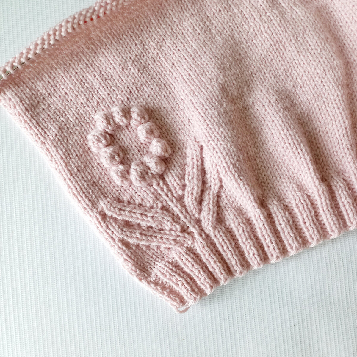 Пока я довязываю кофту, хочу с вами поделится схемой цвета. Его можно связать на лицевой глади и он отчетливо будет виден. Очень часто подобные цветы предлагают вязать на изнаночной глади. Но так как я не любитель этим петелек не лицевой стороне, я придумала выход)))) Нарисовала схему, где выделила листья с помощью изнаночных петелек. А стебель связала вытянутой лицевой. Можно применить и скрещенную)). Вытянутая лицевая провязывается не в петлю на спице, а в петельку на ряд ниже. Накиды вяжем, с изнанки, изнаночной петлей. При вязании по кругу - лицевой. 2 петли вместе с наклоном вправо - вяжем за переднюю стенки петелек. 2 петли вместе с наклоном влево - за заднюю стенки. Шишечка - 1 петлю вяжу из протяжки, 3 петли ( лицевая/накид /лицевая) и с самой петли, затем 1 петлю из протяжки. Всего 5 петелек - это первый ряд. 2 р - 1 кромочная, 4 изнаночных. 3 ряд - 1 кромочная, 4 лицевых. 4 ряд - 1 кромочная, 4 изнаночных. В 5 ряду 3 петли снимаем, следующие 2 провязываем вместе и накидыва