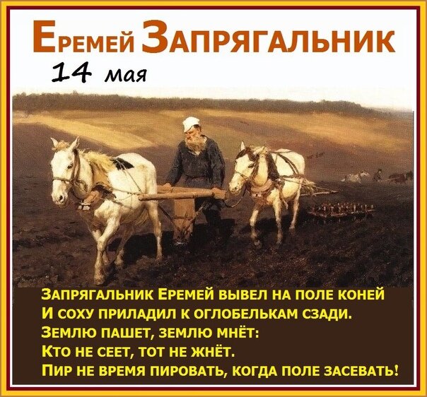 14 мая называют днем Еремея запашника. Народные приметы в этот день: - Солнышко ясное - значит лето будет ясное; - На Ерему погоже - уборка хлеба пригожа; - Непогода на Ерему жди суровую зиму; - С вечера уже роса - значит ясно завтра; - Шишки на ёлке уже распустились, нужно сеять спешить; - Если жаркая погода выдалась на Ерему, значит жаркая летняя погода продержится до октября.