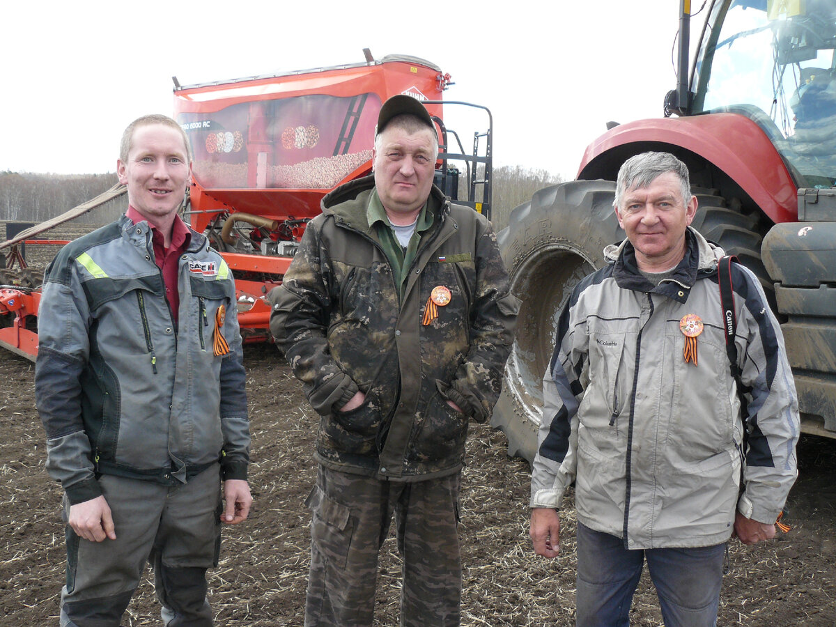Первого мая мы с М. Л. Беликом, председателем профсоюзного комитета, отправляемся на поля, чтобы поздравить механизаторов с праздником труда и весны, с приближающимся Днем Победы. К весне, Туда, Где грудь так вольно дышит, Ведет лишь труд, в котором - Черный пот. (А. Атнабаев) И я вновь ощущаю радость от созерцания весеннего обновления природы: ослепительного солнца, играющего золотистыми пушинками вербы и зеленкой дымкой берез, окруживших поля, жадно вдыхающие свежесть весеннего неба. И какое великолепное зрелище - мощные трактора с посевными комплексами, весело приветствующие нас веселым гулом моторов. Едет трактор по морю земли, Едет трактор по морю весной, Ветерок доносит из дали Запах лип, черемухи густой. Как вы дороги, мои поля, С тракторным задумчивым дымком И с грачиным громким говорком. (В. Фирсов) На первом поле мы встречаем водителя "Урала" А. А. Федотова, занимающегося подвозом семян. Михаил Леонидович поздравляет его с праздником труда и вручает георгиевскую ленту со зна