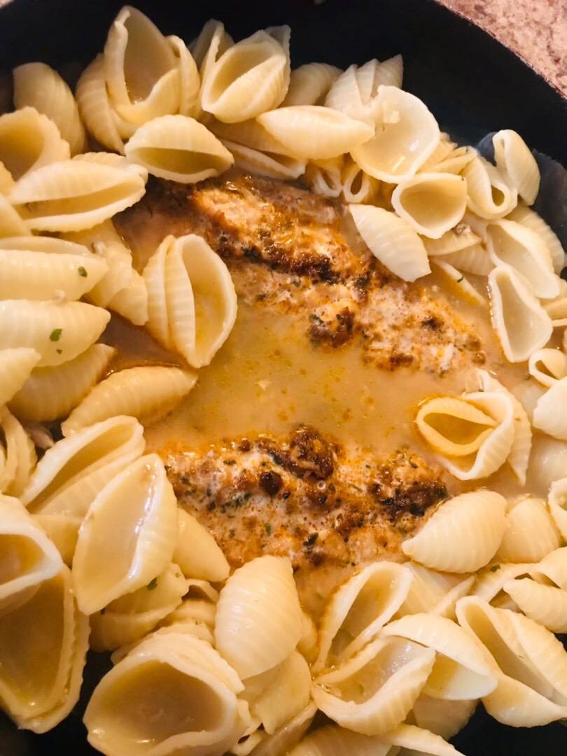Ингредиенты: скумбрія, макарони, паприки, часнику, петрушки, олія, вершкового масла, Бульйон, хребет скумбрії, духмяний перець горошком, вода Способ приготовления: Рибу розподіляємо на філе. Змішуємо в одній мисочці паприку, часник, петрушку, олію та масло (масло потрібно розтопити) і змащуємо цією заправкою філе риби. Варимо бульон. Кістки які залишилися заливаємо водою, та ставимо на великий вогонь додаємо духмяний перець та сіль. Заливаємо цим рибу ГОЛОВНЕ, щоб бульон покривав лише низ риби, не потрібно заливати її повністю. Варимо макарони на бульйоні який залишився. Запікаємо рибу при температурі 200С, 25-30 хвилин. Додати макарон та полити все юшкою яку утворила риба при запіканні. Смачного!😉