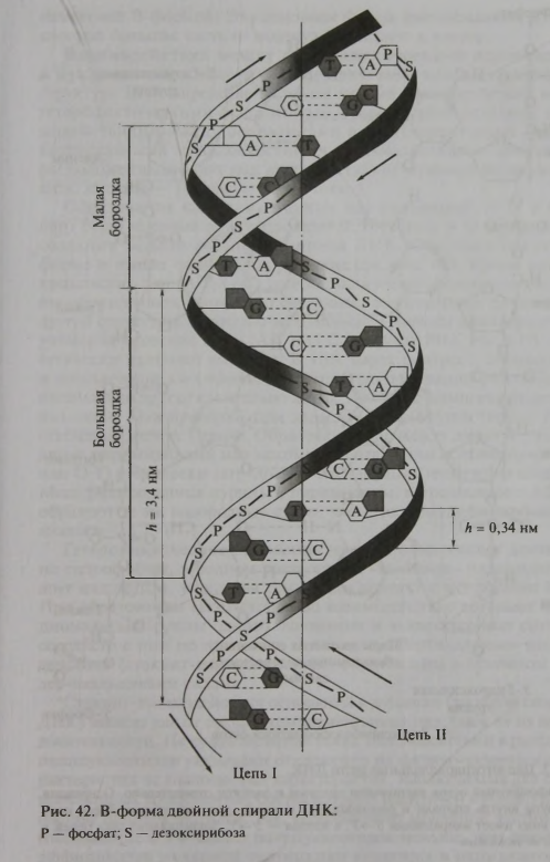 В предыдущей статье мы рассмотрели, при помощи учебника, из каких элементов состоит ДНК и выяснили, что в состав молекулы входит всего 6 типов небольших молекул: дезоксирибоза, азотистые основания (аденин, тимин, гуанин и цитозин) и фосфат. В параграфе “Макромолекулярная структура ДНК” рассказывается, как все эти молекулы и составляют главную молекулу ДНК. “В 1953 г. Дж. Уотсон и Ф. Крик предложили модель структуры ДНК. При построении модели ученые основывались на четырех группах данных: 1. ДНК представляет собой полимер, состоящий из нуклеотидов, соединенных 3'-5'-фосфодиэфирными связями. 2. Состав нуклеотидов ДНК подчиняется правилам Чаргаффа: в любой ДНК содержание пуриновых нуклеотидов (А+G) всегда равно содержанию пиримидиновых нуклеотидов (Т+С); число остатков А всегда равно числу остатков Т, число остатков G — числу остатков С. 3. Рентгенограммы волокон ДНК, впервые полученные М. Уилкинсом и Р. Франклин, указывают на то, что молекула обладает спиральной структурой и содержит бол