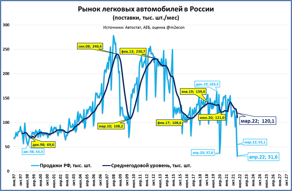 Напомню, что это данные продаж от производителей (не путать с регистрациями). Регистрации же упали со 171,4 тыс. в апреле 2021 до 28 тыс. в апреле этого года (-84%), сообщает Автостат.